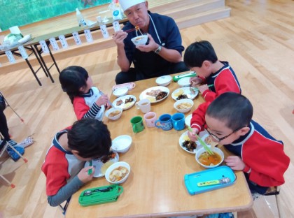 今日は、楽しみにしていた園長コックがあり、すいとん作りを行いました。グループのお友だちと協力しながら一人ずつ、お仕事も責任を持って行う姿がありました。小麦粉を混ぜる際には、「もちもちして気持ち良いなー」と話す子もいました。また、「この大きいすいとん入れたらすぐお腹いっぱいになっちゃうかも!」と期待を膨らませながらすいとんを運び、茹でる様子をみる子どもたちがとても可愛らしかったです。出来上がったすいとんを「おいしい!」ととても喜んで食べる姿があり、たくさん作ったすいとんもおかわりをして全て完食できました!