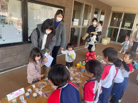 終わった後は、お店屋さんとして活動の中で作った品物をプレゼントしました。新入園児のお友達も、りんご飴やアイスクリーム、ドーナツなどの品物に喜んでくれてる姿がありました。「新しいお友だちいつくるの?」「明日?」とお友だちの入園を心待ちにしているようでした。