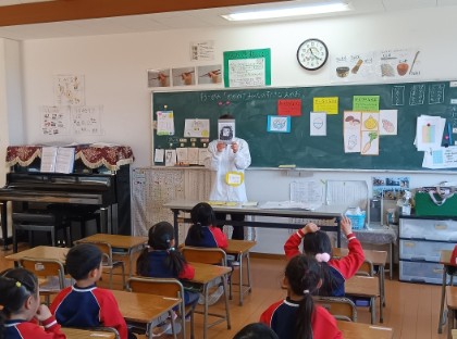 毎日美味しい給食を作ってくれている給食の先生との会食ということで朝から期待が高まっている様子が伺え、貴重な時間を過ごすことができました。食材の3色の分類は、進めていくうちに「野菜は緑の力」ということを理解し、野菜のイラストが出た瞬間に元気よく答える姿がありました。分類するだけでなく、赤色•黄色•緑色それぞれどんなスイッチが入るのかについてもお話いただき、より理解が深まったように思いました。野菜の花や切り口クイズもよく考えて、楽しく学ぶことができました。ナスやきゅうりは夏に園で育てていたことを思い出す子も見られました。今後も食材への関心を深めながら、三角食べも意識して食べられるよう関わっていきたいです。リクエストメニューも楽しみにしている子どもたちです!★そら組担任★
