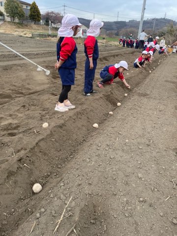 種芋を丁寧に並べて、種芋が出てこないようにしっかりと土を盛りました。「出てくると太陽に当たって緑色になっちゃう!」と教えてくれたお友だちもいました。