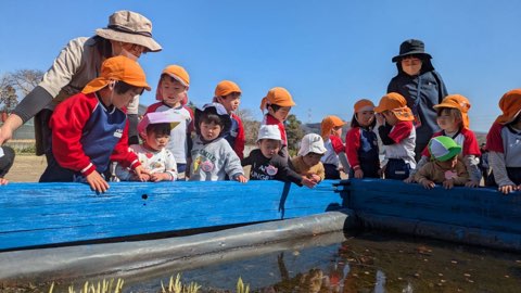また、その後は散策に出掛けると、バタフライガーデンでカエルの卵や、スイセン、オオイヌノフグリなど、春の訪れを感じることができました。