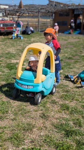ちびっこ広場まで行き、思い思いの遊びを楽しみました。たんぽぽ組さんの遊具への挑戦をお手伝いしたり、車の乗り物を後ろから押してあげたりして、良い交流の機会となりました。クラスに戻ってきてからも「可愛かった!」「また遊びたい!」と嬉しそうでした。