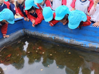 次にバタフライガーデンの池にいきました。たくさんのカエルの卵があり、興味津々なこどもたち。カエルの卵だと伝えると、「カエル?」と不思議そうにしていました。
