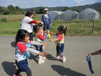 今日は散策に行きました。畑の野菜の名前を覚えたお友だちもおり,通ると「はくさい!」「ブロッコリー!」と教えてくれます。ミカンの実が黄色くなってきたのを観察し,葉っぱを触ったり,においを嗅いでみたり楽しんでいました。イチョウの木の近くを通ると,落ちてるぎんなんを見つけて「これなあに?」と興味津々でした。駅伝の練習もみることができ,「がんばれー!」と応援してくれました。今後も自然とのふれあいを楽しめるよう関わって参ります。〇ひかり組担任〇