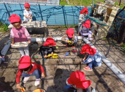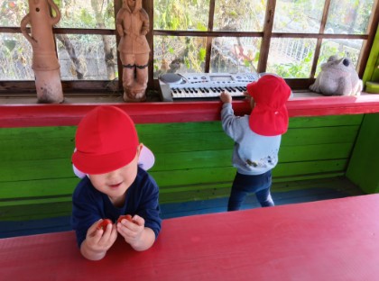 今日はちびっこ広場で遊んだにじ組さん。少しずつ遊びの幅が広がり、ハウス内のキーボードで弾き歌いのようにしていたり、タイヤ渡りに挑戦してみたりと楽しんでいました。今日は砂場の近くにカラスウリを見つける事もできて、興味津々でした。以前からあったブドウにも気づいて、「みて!」「あったよ!」と大喜びでした。引き続き、子どもたちと活動を充実させていきます。
