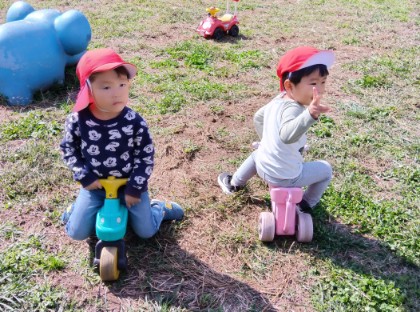 今日は天気が心配でしたが、すばる組が外に出ると太陽が出てきていいお天気になりました。ふれあいの日ということで、わんぱく広場に行くと喜んでいたお友だち。歩ける子は、にじ組やひかり組のお兄さん・お姉さんに混ざりながら、自由に歩いたり、落ち葉に触れて楽しむ様子が伺えました。ハイハイや伝い歩きの子も、ボールプールの中におろしてあげると嬉しそうにボールに触れる姿がありました。
