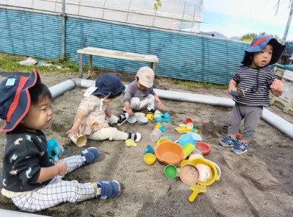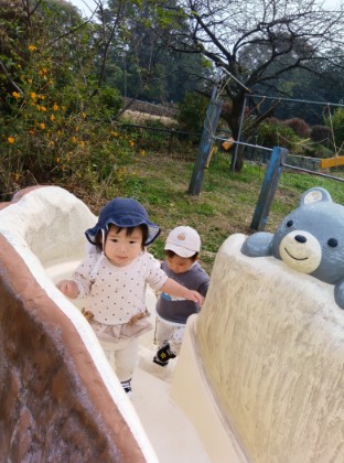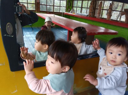 今日はちびっこ広場に行って遊んで来ました。広場に着くなり自動車や砂場などそれぞれの子が興味のある遊びへと向かい遊び始められました。まだ、靴を履かない月齢の低い子たちはちびっこハウスの中に連れて行くと、思い思いにハイハイやつかまり立ちを楽しんでいました。大きな鏡の前に立たせてあげると、鏡に映った自分を見て喜ぶ姿がとっても可愛かったです!月齢の高い子たちの中には砂場で集中して夢中になって遊び込んでいた子も伺えました。初めて、滑りだいかの存在に気がついて滑り出したお友だちを真似て、数人の子もやって来て楽しもうとする姿もありました。以前の滑り台の経験から、一度滑ったら逆走せずに階段から登って滑ることの理解ができていて、子どもたちの成長を目の当たりにしてとても嬉しい気持ちになりました。これからも、危険のないように見守りながら、楽しい経験をたくさんさせてあげたいと思います。