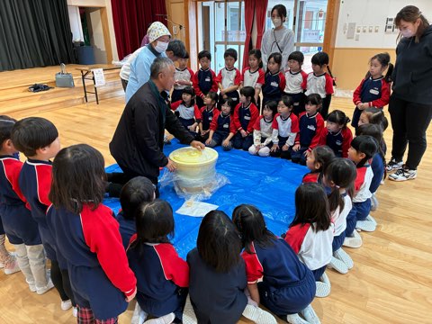 今日は昨年、年中組の時に作った味噌だるを開けました。「何色になっているかな?どんな匂いになっているかな?」などを期待を高めていた子どもたち。ふたを開けると真っ平な茶色の味噌が出てきて、「すごーい!」と歓声があがりました。