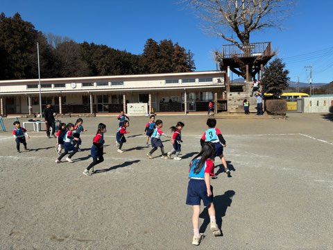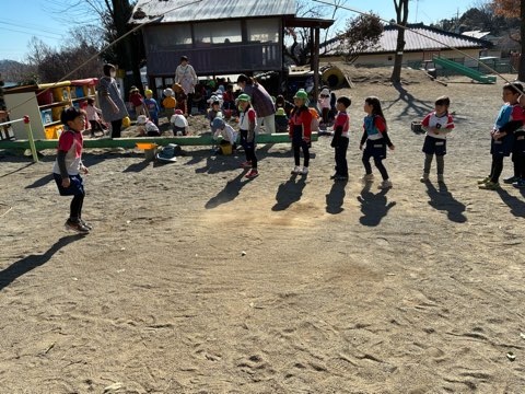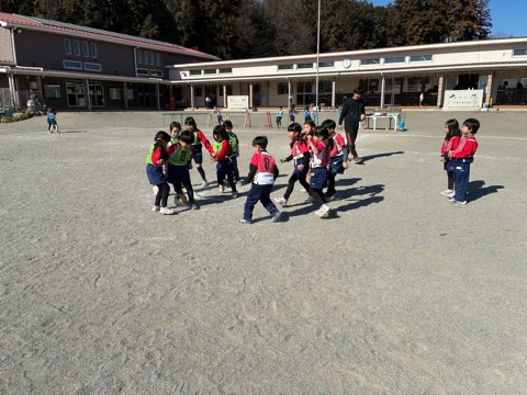 園庭とわんぱく広場にて、サッカーの練習試合を行ないました。サッカーに興味のある子は、戸外遊びの際にチーム関係なく試合形式で練習をしていましたが、初めてチームになり試合をしてみると、みんなでボールを追いかけるチーム•攻められてしまうチームなどチームごとの特色も見えてきました。全体的にサッカーへの意欲が高まり、ボールの蹴り方やルールも理解してきたところではありますが、ゴールしたり、友だち同士声を掛け合ったりするのはまだまだ難しい様子が伺えますので、園長カップまでの間にチーム全体で士気が高まるよう後押しきていきたいと思います。動物当番では、ヤギの水飲み場が凍っているのに大興奮でみんなで取り出して割るところまで楽しみました。年明けからうさぎのだいやの左目が不調ですが、少しずつ良くなってきました。動物当番する中で、子どもたちの気づきを大切にしながら経過観察して参ります。★そら組担任★