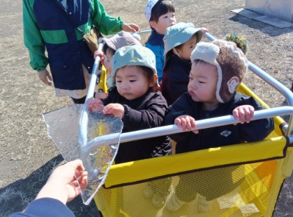 今日も戸外に出ることを喜んでいたすばる組ぐみさん。暖かくなってきたけど氷はどうかな?と、バタフライガーデンの池を観察に行くと、まだ氷があり嬉しそうな子どもたちでした。氷に触って「ちゅめたい」とお話したりと、パリーンと割ったりと楽しんでいました。