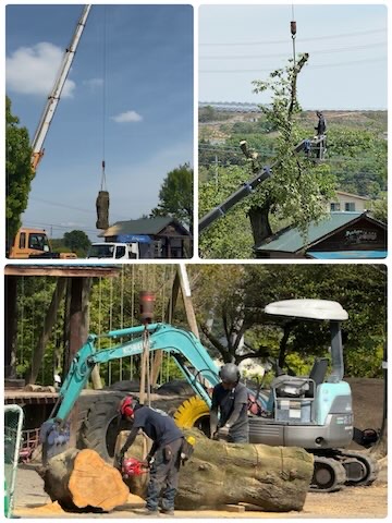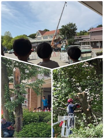 大きなクレーン車やチェーンソーを使って、木を切る姿を子どもたちと見守りながら、伐採の様子を見学しました。